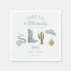 Rustic cowboy theme baby shower paper napkin featuring illustration of a cowboy boot, hat, cactus, and snake. The text says "saddle up a little cowboy is on the way."