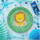 This party plate features a green background with a repeating pattern of jungle leaves. A cute baby clipart brown and orange lion sits in the centre of the plate.