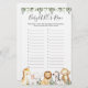 Safari animals themed baby shower ABC's race game card features a watercolor safari animals illustration and watercolor greenery eucalyptus garland and elegant handwritten style font.