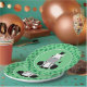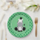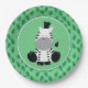 This party plate features a green background with a repeating pattern of jungle leaves. A cute baby clipart black and white zebra sits in the centre of the plate.