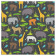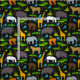 Use this Safari Animals Print Fabric for any home decor project for a child's bedroom. The fabric features an all-over print with silhouetted gorillas, hippos, giraffes, zebras and lionesses in grey, tan, yellow and brown. Jungle trees, wild grass and blue birds add visual interest. The background comes in black.