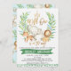 Cute little wild one is on the way, safari themed baby shower invitation for a little boy. This sweet design features three watercolor jungle animals, some foliage, banner and decorative elements. Sure to set the scene for an up-becoming little boy's baby shower.