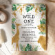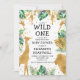 This "wild one" jungle safari themed baby shower invitation features gold faux foil animals (giraffe, lion and monkeys), gold and green jungle foliage, and a sprinkling of gold confetti on a white background. Add the name of the mum-to-be and shower details in black text. A coordinating jungle foliage pattern in green and gold on a white background decorates the back of the card.