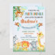 This summer birthday invitation features yellow giraffe, elephant, lion, tiger, monkey, zebra and two birds holding garland with an age.