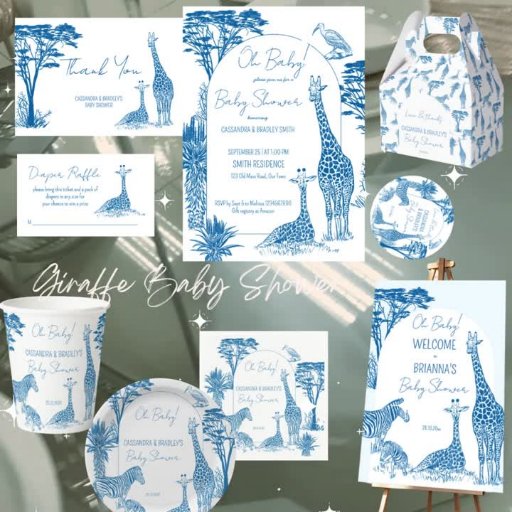 Safari blue toile giraffe baby showerDesigned by Ieva Jenciute