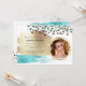 A wonderful modern, abstract and trendy design on a stark white background featuring rough brushstrokes in faux gold on which flecks of faux gold confetti rest. They have black and turquoise blue polka dots below them and a large faux gold metallic foil splash on which black templates for your personalised wording appear. A hexagon photo frame rests on the right bottom edge and the overall feel is elegant, chic and luxurious. These are ideal for birthday, graduation, engagement, anniversary and wedding parties as well as bridal showers.