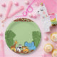 Safari theme with jungle leaves, cute a giraffe, zebra, tiger and elephant illustrations. The giraffe pattern continues through other items in this collection. Discover the complete set from our shop. Green background on the plate can be easily changed using the customisation tool. Great paper plate for a safari birthday, baby shower party.
