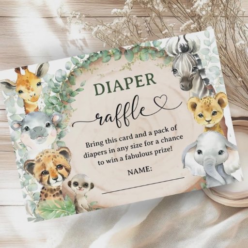 Elevate your Baby Shower with our "Safari Baby Shower" Diaper Raffle Cards, and give your guests the possibility to participate in the Diaper Raffle! Give them the chance to win amazing prizes while helping the parents-to-be prepare for their bundle of joy. Don't miss out – grab your Diaper Raffle Cards now and make your baby shower even more special!