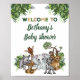 Safari/Jungle baby animals welcome sign in gender-neutral green and brown earth tones. Features an Elephant, Zebra, Giraffe, Snake, Rhino, Lion, and Monkey. Designs are all © Party Sparkle Designs