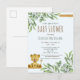 This cute jungle safari themed baby shower invitation postcard is sure to make your friends and family smile when you invite them to your baby shower for a girl or a boy. This gender neutral design features a sweet baby lion framed by eucalyptus botanical leaves and gold trim.