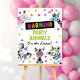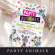 Excite your guests with this wild and colourful safari party animals birthday poster with the message "Warning... Party Animals on the Loose!" Featuring a fun crew of jungle animals — giraffe, lion, zebra, elephant, and hippo — in bright neon colours, it sets the tone for a wild celebration. Perfect for a safari, jungle, zoo, or animal themed birthday party for kids (boys or girls).