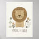 Complete your safari decor with this charming and comforting lion portrait print. The artwork features a sweet, stylized lion surrounded by a magnificent, striped mane. Set against an ivory white background and accented by subtle botanical elements, the design is both modern and gentle. The positive caption, "STRONG & SWEET," makes this an inspiring piece of decor to encourage bravery and kindness in a young child. This poster is an excellent choice for a gender-neutral or jungle-themed bedroom or playroom. Part of our coordinated 'Kid's Safari Decor' collection. Note: design adapted from generative content.