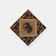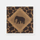 Giraffe animal skin background with a dark-chocolate brown elephant silhouette set in the centre of a medium-brown grassy "textured" square bordered with a pattern of decorative tall-grass blades.