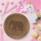 Dark brown elephant silhouette on a tan safari style textured background with light brown tall-grass blades border.