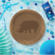 Dark brown rhino silhouette on a tan safari style textured background with light brown tall-grass blades border.