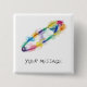 A rainbow safety pin badge, with space to put your own message / name / slogan underneath. The art is a hand-drawn pin, with messy paint blobs in bright colours.