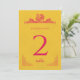This elegant design, called Saffron and Pink Peacock Indian Wedding, has a pretty saffron yellow background with a very light pattern. On the front of the invitation there is a pink peacock design with filigree scroll accents. The back has a saffron yellow background with your text in pink. This set has invitations, save the date cards, response cards, thank you cards, table number cards, wine labels, wedding programs, and many more day-of wedding stationery pieces, favours, and gifts to coordinate. All elements are printed on our high quality products, they do not include any real gold, jewels, embossing, or other textile elements. All designs are copyright Noteable Expressions, Inc. All rights reserved.