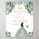 This elegant and glamourous birthday party welcome sign features a beautiful princess with dark skin in a sage green ball gown. The text combines handwritten script and modern sans serif fonts for a classy and sophisticated look. The floral arrangements, butterfly and gold confetti create the perfect blend of rustic and chic.
