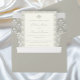 The interior showcases an intricate botanical motif, creating a subtle yet eye-catching detail when opened. The outer pocket provides a clean, structured look while neatly holding your invitations, RSVP cards, and additional inserts in place.