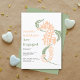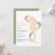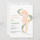 Seahorse and seaweed in sage green and peach beach engagement party invitation. It showcases a peach seahorse and sage green seaweed while the names and the text "are engaged" are written in a modern bold typography. This modern whimsical template design is perfect for a summer beach engagement party. The back is of solid sage green colour.