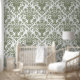 Sage Green and White Damask Floral peel and stick Wallpaper