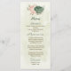 Beautiful romantic wedding menu card featuring sage green and blush pink flowers and some pretty leaves .