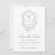 This save-the-date wedding photo card features a classic French Victorian sage green floral crest, with a QR code and custom text on the back. For more advanced customisation of this design, please click the BLUE DESIGN TOOL BUTTON above!