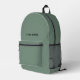 Easily personalize this simple and cool backpack adding your name or custom text. A cool and modern design in organic sage green featuring clear sans serif font, for a modern, professional and edgy look, perfect as custom gift for college students, high school, kids. The backpack can be customized in any color and any font. No minimum.