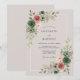 This romantic design features a soft color palette of sage green and dusty rose set against a warm neutral backdrop. Lush bouquets of watercolor roses and delicate eucalyptus foliage create an atmosphere of timeless elegance. The artistic floral elements provide a graceful botanical aesthetic perfect for a refined spring or summer event.