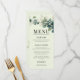 An elegant sage green eucalyptus wedding menu featuring boho watercolor greenery and corner botanical designs with calligraphy script.