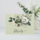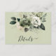 This elegant wedding details card features a soft sage green background adorned with a delicate arrangement of watercolor florals in muted ivory, eucalyptus, and dusty green tones. The front showcases a beautifully layered botanical cluster with subtle greenery and soft blossoms, paired with a graceful script “Details” title that adds a romantic, refined touch. The back continues the cohesive design with a minimal botanical accent along the side, providing a clean and organized layout for important wedding information such as reception details, accommodations, and website information. Perfect for modern, garden-inspired, or nature-themed weddings, this timeless design blends sophistication with soft, organic charm.
