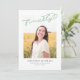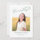 This modern graduation announcement features the word finally written in sage green over a single photo. The back of the card can be used for additional text or as an invitation.