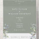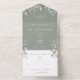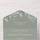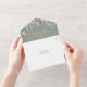 All in one wedding invitation featuring pretty watercolor greenery foliage and elegant modern typography on a sage green background. The invitation includes a perforated RSVP card that can be individually addressed or left blank for you to handwrite your guest's address details. Designed by Thisisnotme©