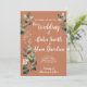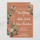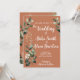 Wedding invitations featuring watercolor sage green floral leaves with blush and ivory flowers on a terracotta background.