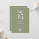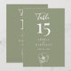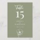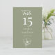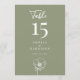 This Sage Green Elegant Floral Wedding Reception 5x7 Table Number showcases a large table number in white on a sage green background, with modern typography and script calligraphy, and a line art floral accent. It is fully customisable with the table number, couple's names, and wedding date.