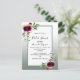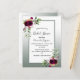 On front: Sage green gradient with a sage green and white frame. Decorated with flowers, roses in burgundy with greenery. Templates for the bride to be's names and party details. The name and Bridal Shower are written with a hand lettered style script, black coloured letters.