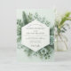 Evoke a sense of serene woodland elegance with this modern botanical design. A delicate palette of soft sage green and dusty mint highlights an arrangement of lush succulents, pine sprigs, and assorted greenery. The artwork's ethereal, misty quality creates a tranquil and sophisticated atmosphere for your special day.