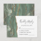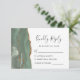 The left-hand edge of this elegant modern wedding RSVP card features a sage green watercolor agate border trimmed with faux gold glitter. The text is in charcoal grey handwriting script and copperplate font on a white background. The reverse side features a matching sage green and gold agate design.