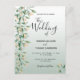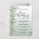 On front: Botanical theme. Sage green gradient, ombre background. Decorated with greenery, sprigs and foliage with small golden flowers. Modern large hand lettered script, typography with the text: The wedding of. Templates for Your names and wedding details. Black text.