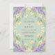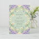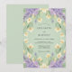 This design features a soft sage green backdrop adorned with a delicate collection of spring blossoms. Painterly watercolor lavender, purple irises, and sunny yellow daffodils create a serene atmosphere. The arrangement of verdant leaves and floral petals evokes a lush meadow in full bloom. This artwork captures the essence of a tranquil outdoor landscape.