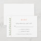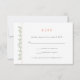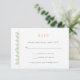This wedding RSVP card features sage green leaves peeking out of the edges of a light coral which runs along the left side of the card. This RSVP card design is perfect for an outdoor wedding full of natural beauty.
