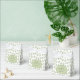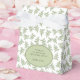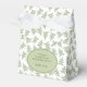 This tent favour box features an elegant pattern of sage green leaves on a white background. A light green oval, on the front, offers custom text for a personal thank you message and the names of the bride and groom.