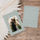 Elegant sage green photo wedding thank you card with a minimalist line art leaf monogram design on the reverse side.