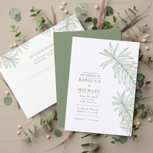 This exquisite botanical leaves wedding invitation beautifully captures the essence of a tropical paradise, making it the perfect choice for couples seeking a touch of nature on their special day. The design features elegant botanical leaves that gracefully frame the invitation, creating a serene and inviting atmosphere. The minimalist esthetic is enhanced by a soft, muted color palette, with hints of sage green subtly woven into the design, symbolizing love and fidelity. Crafted from high-quality materials, this invitation not only conveys essential details about your wedding but also serves as a stunning keepsake for your guests. Ideal for beach or garden weddings, this botanical invitation effortlessly combines sophistication with a laid-back vibe, ensuring your celebration is both memorable and stylish.