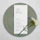 Modern, elegant menu features a minimalist sage green and white design. Personalise with your event's menu with the easy to edit template featuring an elegant script font and classy serif font.