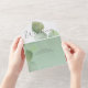 AVAILABLE WITH OR WITHOUT A QR CODE TO SCAN. This design has a soft green watercolor ombre wash background with a single sprig of gold stemmed eucalyptus. Fresh and beautiful! Add a QR code to your invitation so that gusts can quickly access your wedding Website for details, directions, menu options, and more, or add your gift registry Web URL. Personalised All-In-One invitations are a unique combination of both a beautifully printed custom invitation with an easy to tear off perforated RSVP postcard. And they are so easy to use! You simply fold, then seal the back flap with the three included clear stickers, and mail. And when your guests receive your custom invite, they just tear the perforated RSVP Card off and drop it back in the mail to you!
