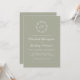 This elegant wedding invitation design features a white script monogram initial encircled by a line art botanical wreath on a sage green background. The names appear in white script, with the rest of the text in classic serif font. The back of the card is sage green.