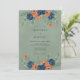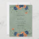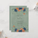 A muted sage green background is adorned with lush floral arrangements in shades of navy blue and burnt orange. Atmospheric watercolor poppies and ranunculus create a sophisticated and earthy mood perfect for a fall event. The rich, moody palette is complemented by delicate sage foliage and botanical details.