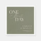 Minimalist wedding rehearsal dinner welcome napkin featuring typography text that says "one more day." The background is sage green.