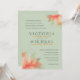Abstract autumn orange flowers on sage green background with wispy leaves and whimsical swirls border this beautiful wedding invitation set. Perfect for romantic garden weddings or formal country estate weddings in any season -- simply change the backbround colour for spring, summer, autumn, fall, and winter. Classic formal text is sure to please the traditional vintage bride, but a splash of sophisticated styling makes it trendy enough for modern brides. Simple but stylish elegance at bargain discounts and affordable prices for frugal brides on a budget. Shown on Basic card stock-- or select paper choices to see premium quality Felt, Linen, Recycled or Metallic paper options. Customise it to change the font colours and styles. Please contact us if you would like this design modified to match your bridal party colour theme. This easy to use template can also be personalised for any special occasion such as engagement and marriage announcements, anniversary party invitations, womens feminine birthday party invitations, corporate and business events, charity fundraisers. Please contact us for assistance if you need help to create your own unique one-of-a-kind invitations. CARD SIZE: 5.5 x 7.5 inches -- other sizes, colours, and paper styles available.